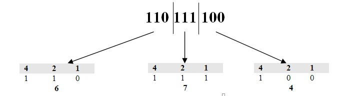 This gives us the result of 674 in octal. The process to convert to octal is very straight forward. You split the binary up into groups of 3 bits (starting from the right always). You then convert each group of 3 bits into denary. This will then give you the final octal answer. A common mistake is to add up the results of this (so 6 + 7 + 4 = 17). However this is incorrect