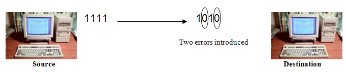 A single parity bit will not be able to spot all errors. Things will be fine as long as there are always a odd number of bits with errors in the packet. If there is an even number then the error will not be detected. This example has only one bit in error. As we have an odd number of ones the destination can easily work out that there was an error. Because only an odd number of bits changed we can spot the error. Here two bits are in error. The destination will not be able to work out that an error has occurred due to the fact that it sees an odd number of ones. As such this packet would have been accepted. As there is an even number of error bits the destination could not pick up the error. |