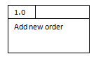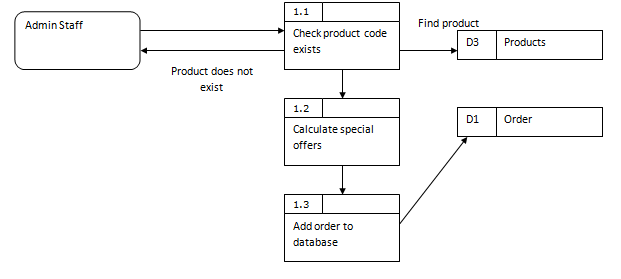 The above diagram shows that the add order process actual involves a number of steps, including a error response if a invalid product has been chosen. A new data source, products, has been added which could have been overlooked if the process had not been broken down. The numbering is very important here. Each process starts with the number 1.x to show it is the break down of process one. We call this a level 1 diagram. The original diagram is called a level 0 diagram. If we decided more detail was required for process 1.2 (Calculate special offers) then we would draw a level 2 diagram. The processes would then be numbered 1.2.1, 1.2.2, 1.2.3 and so on. |