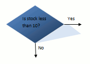 The diagram is fairly simple but covers a lot of the main points. It shows how a the stock control part of an order may occur. First of all stock is checked to see if stock is low (not that stock exists). The idea being that if there is low stock then you will preempt running out by ordering early. This requires input to say what the current stock level is. Notice that it is a Boolean question, or a yes/no question. This means the analyst must provide both paths in order for it to be complete.