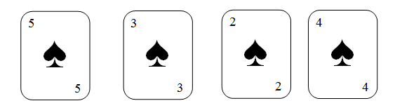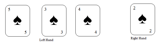 Consider the cards above. They are currently not in any order and in a players hand. They must put the cards in order to make the game easier for themselves. The first thing they will do is remove the lowest value card and put hold onto in their right hand.