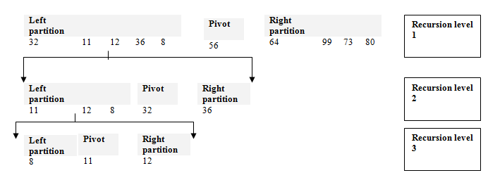 Each time we looked at a new left partition we have been doing the exact same algorithm again. This is known as recursion. We needed three levels of recursion before we found we could go no further. Once this happens we must return to the level above and attempt the right hand side. As you can see the right partition at level 2 has only one element. As such we know that this is sorted. We then look at the right partition at level one. This is not sorted so we again apply the quicksort algorithm.