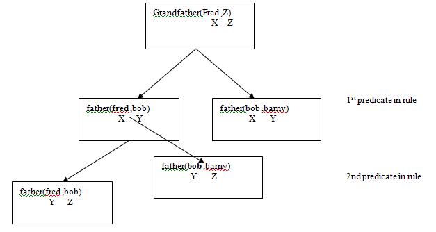 The above search tree shows what logic the code is following. The letters underneath the atoms represent what variable they are to replace. The bold values are successful matches. The first predicate, father(X,Y) has already had X replaced with fred. This was passed in so for the rest of the search X will always be fred. As such when the search tried to match to bob it failed. Bob does not equal fred. So that line of search is removed. We then traverse back out of the search tree and try the left hand side. As fred equals fred we now can match Y to be bob. The 2 nd predicate rule then says that father(Y,Z) must be true. We now have a value for Y, bob, as such we are now looking for a fact which says father(bob,Z) where Z could be anything. We find that father(bob, barny) matches this. As such Z then becomes barny. Finally the result is passed up and the value of Z returned. |