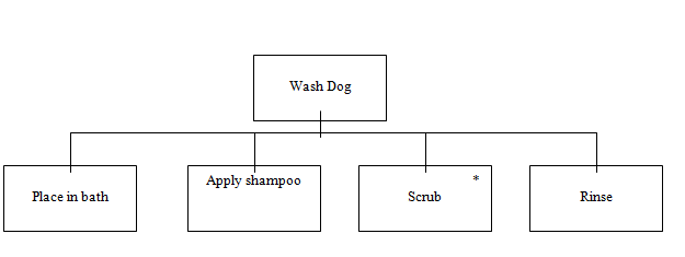 The diagram is read from left to right. In this case we place the dog in the bath, apply shampoo, scrub many times and then rinse. We could break each of these down further. A simple exercise is to think about what decisions might you need to make. For example what if the god struggles when you put him in the bath? |